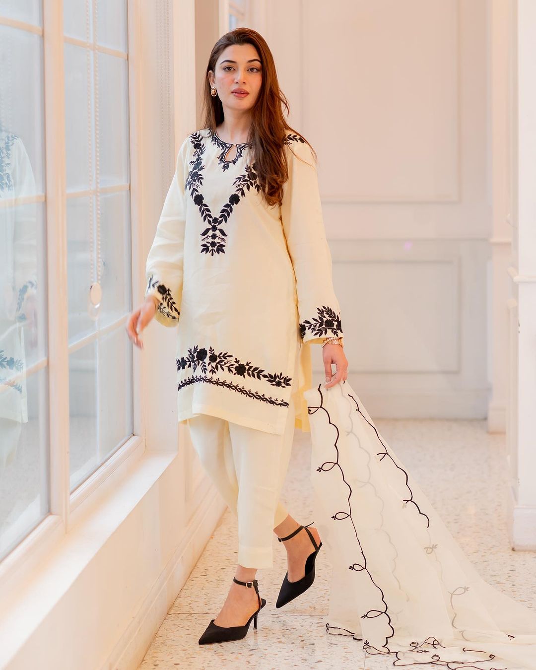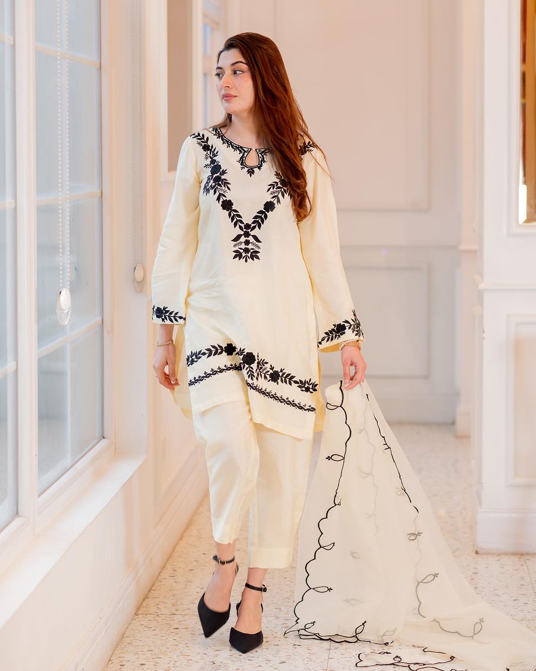 A pristine white cord set elevated with minimal black embroidery, offering a subtle yet striking contrast. Its refined detailing and effortless silhouette make it perfect for understated elegance and everyday sophistication.