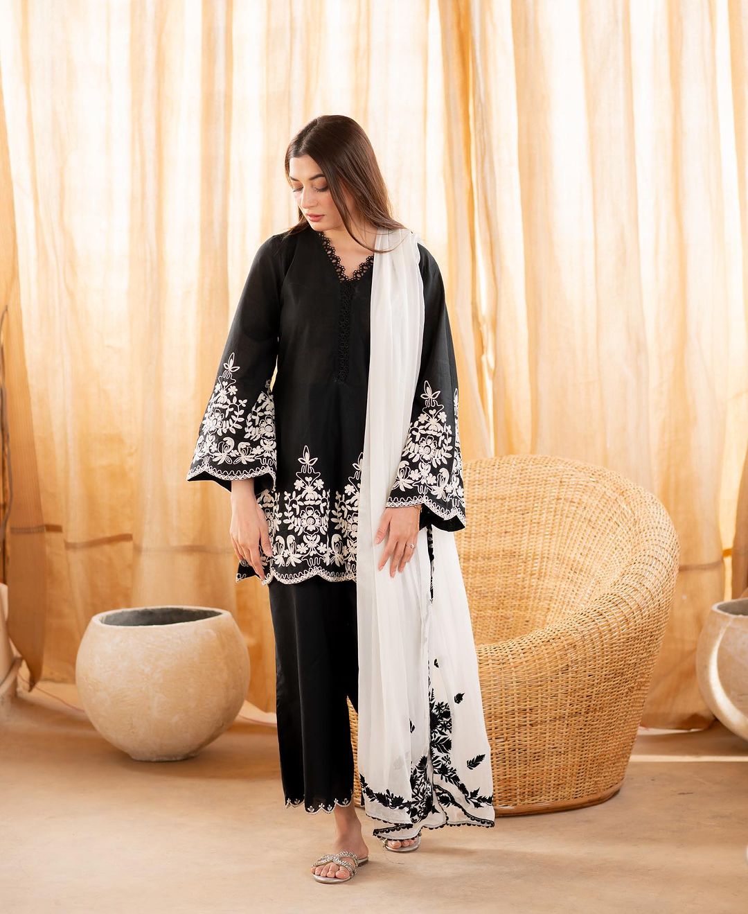 A timeless black cord set adorned with delicate white floral embroidery, blending classic contrast with contemporary charm. Crafted for effortless elegance, this set offers a refined, versatile look perfect for daytime sophistication or evening finesse.
